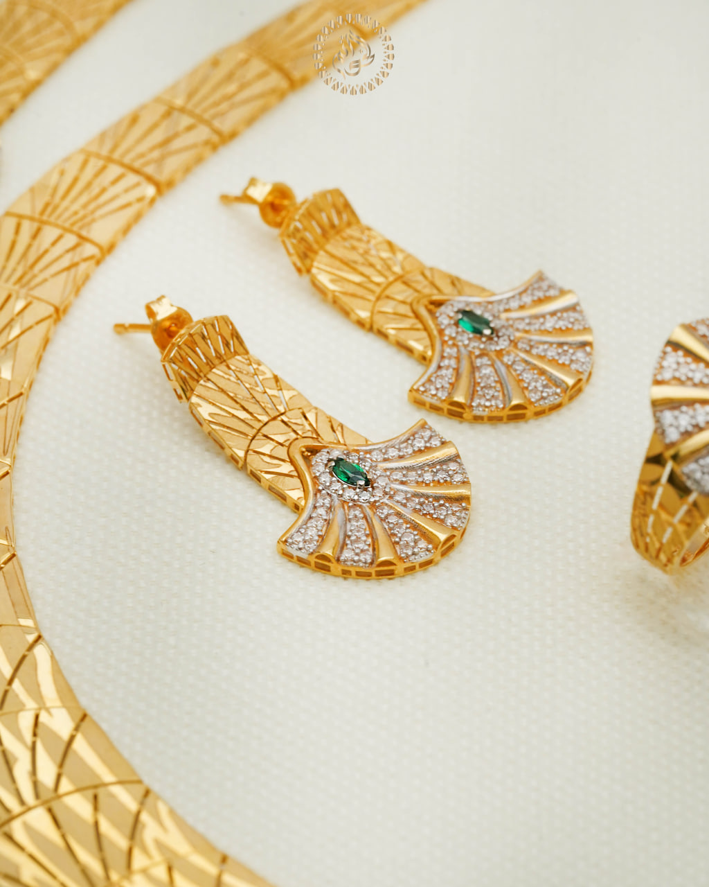 Earring and Necklace Set October 26, 2025 Weight: Approx. 40g Category: Uncategorized Description Description A graceful jewelry set including drop earrings and a matching necklace with fan-style gold motifs. Related products Bracelet and Ring SetWeight: Approx. 18g totalA fashionable gold bracelet paired with a matching ring, both featuring black accent stones. Read more Chain NecklaceWeight: Approx. 30gA classic chain-style gold necklace with a subtle pattern, ideal for layering or solo wear. Read more Patterned BraceletWeight: Approx. 15gA classic gold bracelet featuring Greek-inspired border engravings and a satin-matte finish. Color: Gold Material: Metal Alloy Finish: Matte Weight: Approx. 15g Read more Square BangleWeight: Approx. 25gA bold square-shaped gold bangle with intricate carved textures, offering a unique geometric style. Color: Gold Material: Metal Alloy Finish: Textured Weight: Approx. 25g Read more You might also like Engraved Ring Bangle Set Square Bangle Textured Ring Bracelet and Ring Set Necklace Set