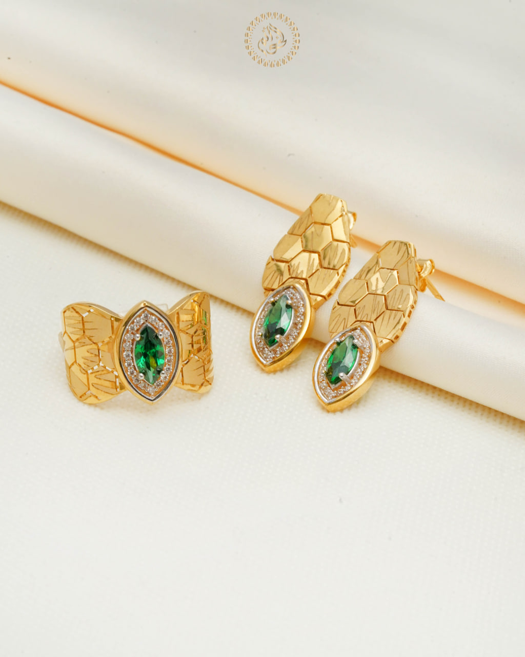 Emerald Ring Set October 26, 2025 Weight: Approx. 10g total Category: Uncategorized Description Description A pair of gold rings accented with green emerald-style stones for a royal touch. Related products RingWeight: Approx. 5gA stylish gold ring with a smooth, interwoven band design. The polished finish gives it a modern yet classic appeal. Read more Textured RingWeight: Approx. 6gA gold ring with a ribbed band design, featuring a matte and shiny contrast finish. Read more Necklace SetWeight: Approx. 35gAn elegant gold necklace set with matching earrings, showcasing a sleek chain and fine detailing. Read more Wide Band RingWeight: Approx. 8gA wide gold ring with deep engravings and a solid appearance, perfect for statement wear. Read more You might also like Twisted Bangle Set Gem Accent Ring Bold Ring Enamel Earring Set Bangle Set Black Accent Ring