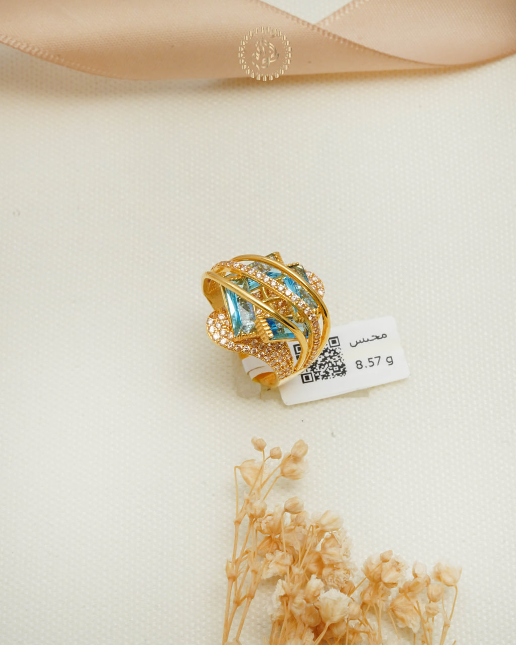 A radiant gold ring featuring a sparkling blue gemstone centerpiece. Perfect for adding a touch of color and elegance to any outfit.