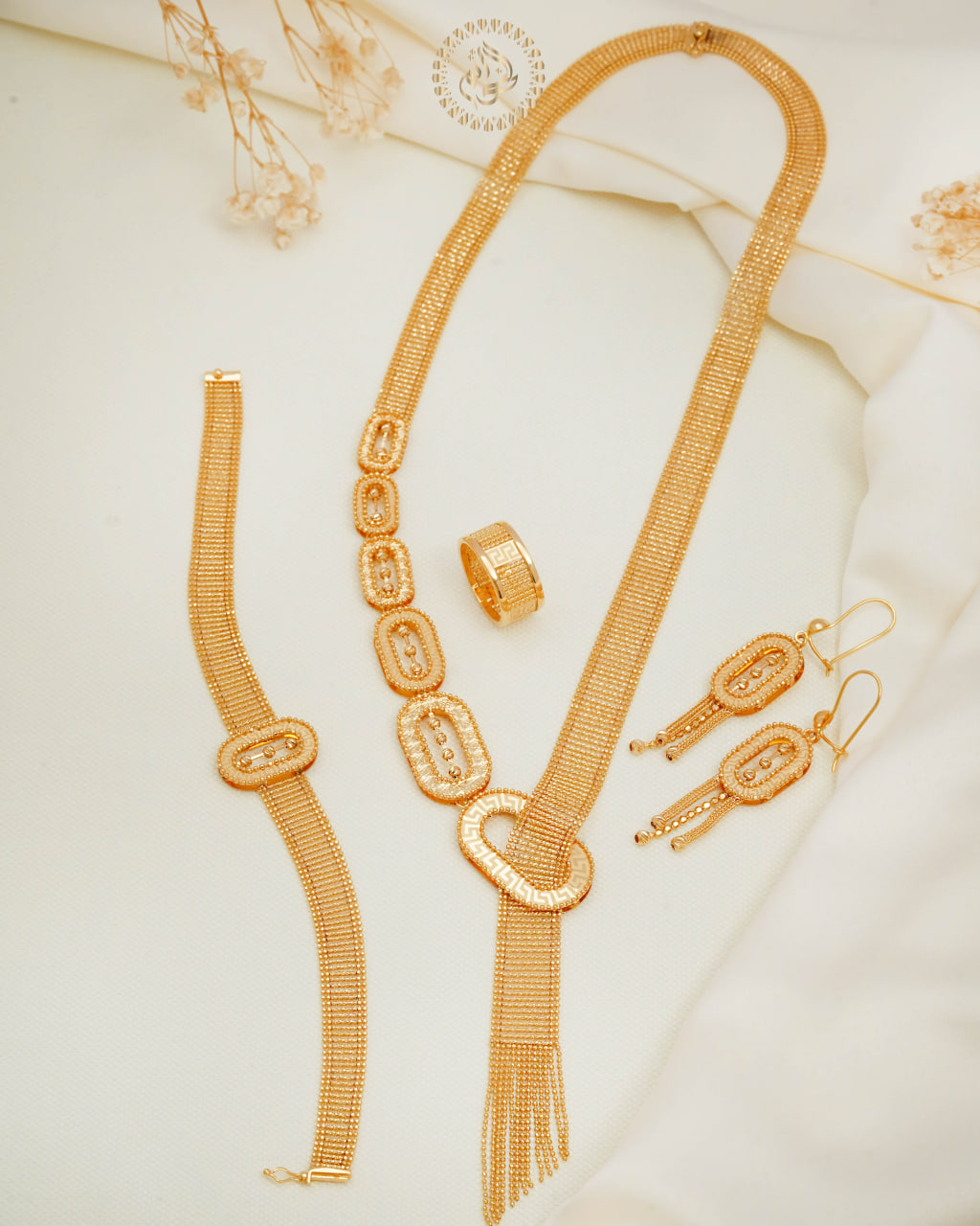 Necklace Set October 26, 2025 Weight: Approx. 35g Category: Uncategorized Description Description An elegant gold necklace set with matching earrings, showcasing a sleek chain and fine detailing. Related products Bracelet and Ring SetWeight: Approx. 18gA chic gold jewelry set including a sleek bracelet and a matching ring. The simple design complements formal and casual styles alike. Read more Floral RingWeight: Approx. 5gA beautiful gold ring with a flower-shaped blue enamel centerpiece, combining elegance and charm. Read more Wide Band RingWeight: Approx. 8gA wide gold ring with deep engravings and a solid appearance, perfect for statement wear. Read more RingWeight: Approx. 5gA stylish gold ring with a smooth, interwoven band design. The polished finish gives it a modern yet classic appeal. Read more You might also like Bracelet and Ring Set Bracelet and Earring Set Gem Accent Ring Gemstone Ring Necklace and Earring Set Square Bangle