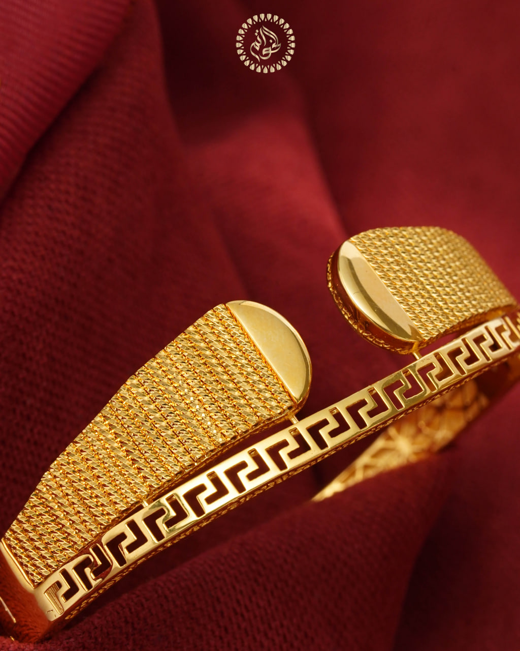 A classic gold bracelet featuring Greek-inspired border engravings and a satin-matte finish.