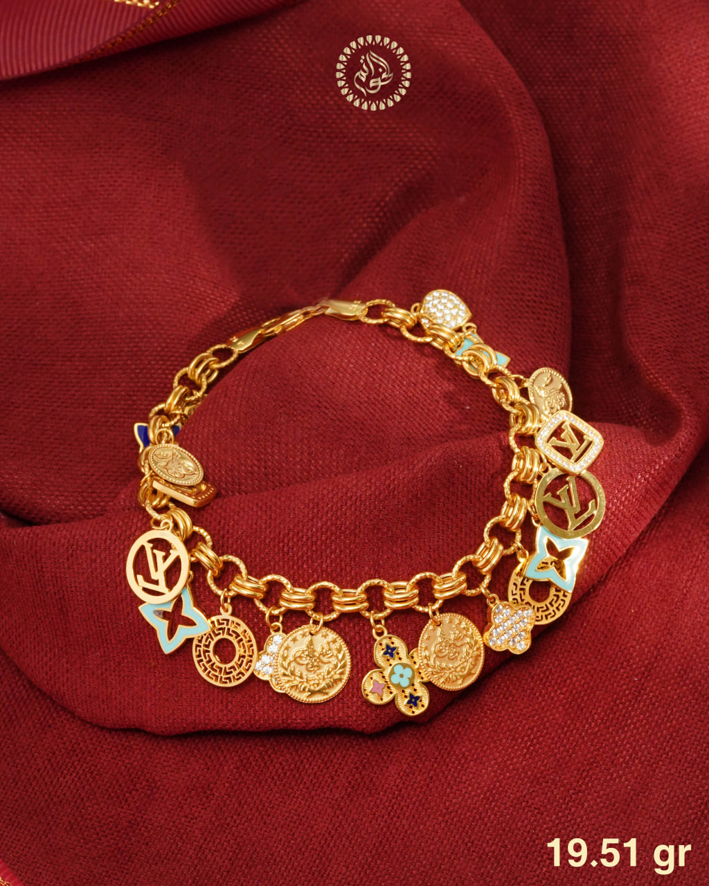 سوار ذهبي فاخر مزين بحليات دائرية تشبه النقود المعدنية مع روابط متقنة التصميم، يمنح مظهرًا فخمًا ومميزًا للمناسبات الخاصة